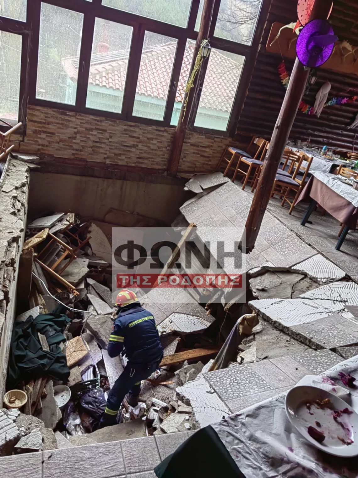 Σύμφωνα με πληροφορίες του fonirodopis.gr, το δάπεδο τμήματος του καταστήματος υποχώρησε, με αποτέλεσμα οι θαμώνες που κάθονταν σε τέσσερα διαφορετικά τραπέζια να βρεθούν ξαφνικά στο κενό.