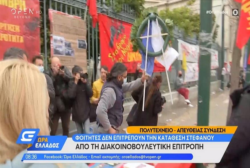 Φοιτητές και συγκεντρωμένοι στον χώρο του Πολυτενείου δεν επέτρεψαν σε βουλευτές της Νέας Δημοκρατίας να καταθέσουν στεφάνι, νωρίς το πρωί της Τετάρτης, 17 Νοεμβρίου.