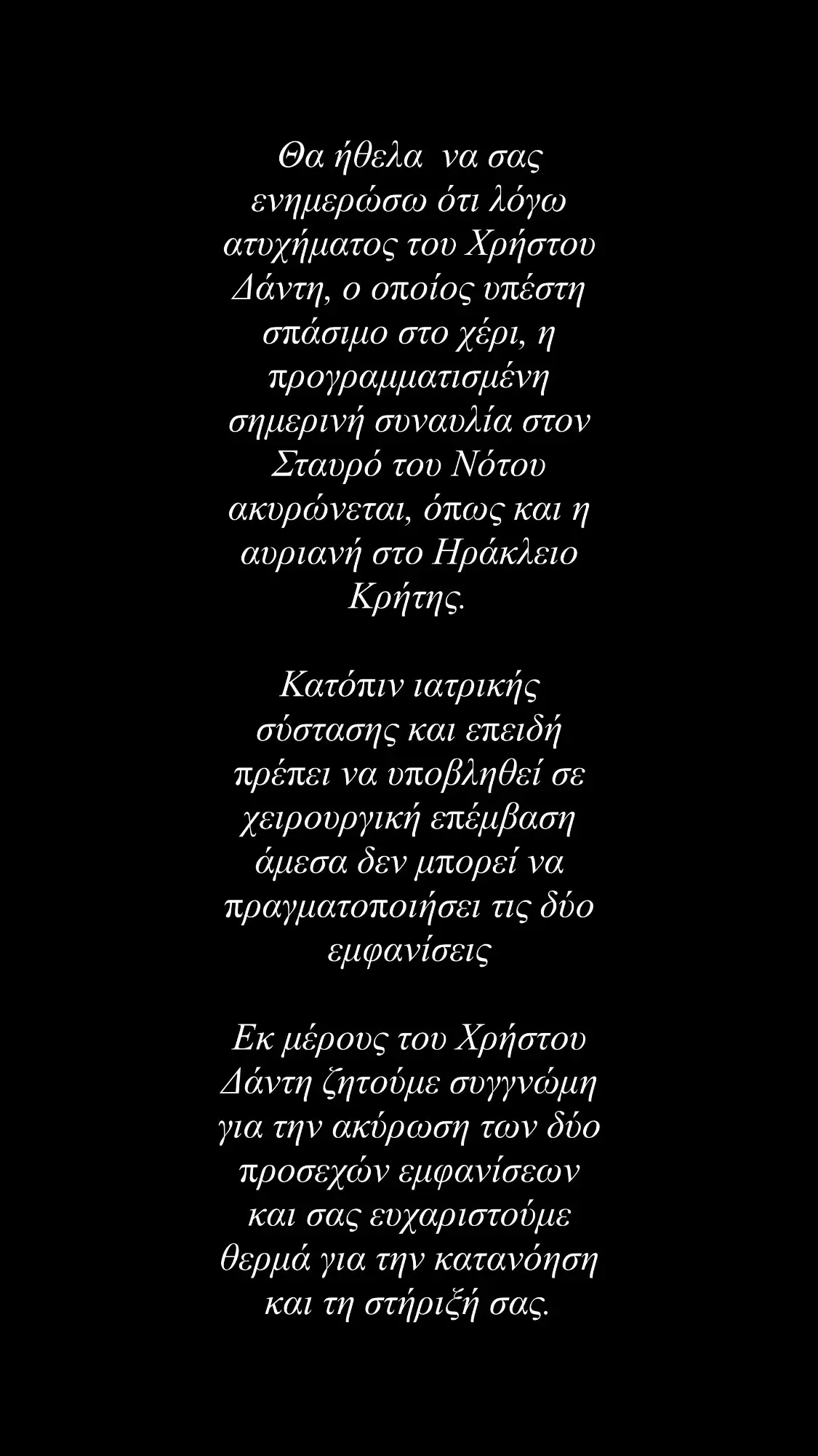 Κατόπιν ιατρικής σύστασης και επειδή πρέπει να υποβληθεί σε χειρουργική επέμβαση άμεσα δεν μπορεί να πραγματοποιήσει τις δύο εμφανίσεις. Εκ μέρους του Χρήστου Δάντη ζητούμε συγγνώμη για την ακύρωση των δύο προσεχών εμφανίσεων και σας ευχαριστούμε θερμά για την κατανόηση και τη στήριξή σας».
