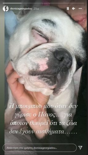 Στο ένα η Διονυσία Γεωργιάδου δείχνει τη σκυλίτσα της που φαίνεται λυπημένη και γράφει: «Η μπουμπού μου, όταν δεν γύρισε ο Πάνος. Για όποιον θεωρεί ότι τα ζώα δεν έχουν αισθήματα».