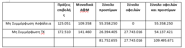 Συνολικά, τα πρόστιμα που επιβάλλονται για τα ανασφάλιστα οχήματα ανέρχονται σε 55,3 εκατ. ευρώ, ενώ για τις περιπτώσεις μη καταβολής τελών κυκλοφορίας τα πρόστιμα φτάνουν τα 26,4 εκατ. ευρώ και οι οφειλές τελών τα 27,7 εκατ. ευρώ.