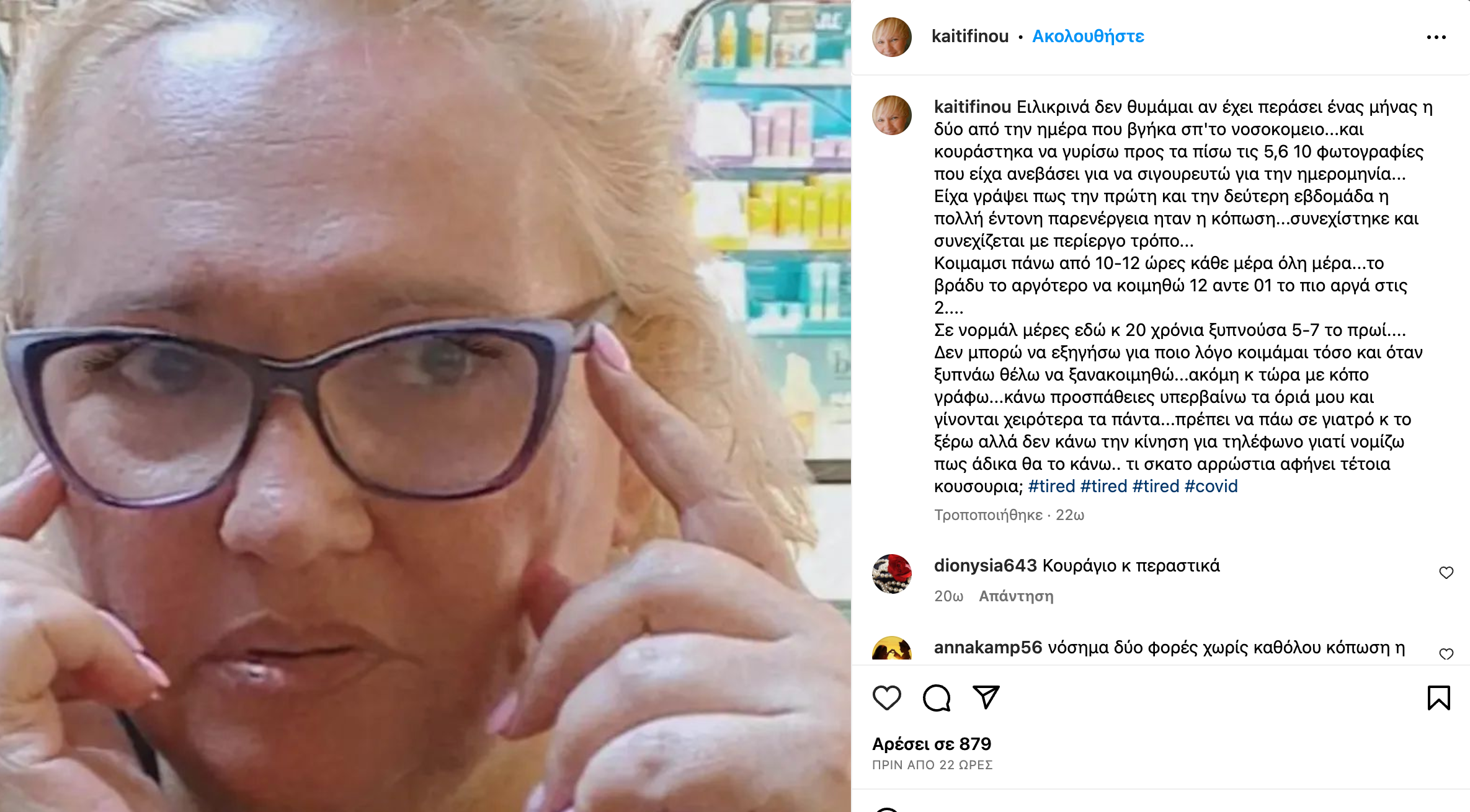 «Ειλικρινά δεν θυμάμαι αν έχει περάσει ένας μήνας η δύο από την ημέρα που βγήκα απ’ το νοσοκομείο… και κουράστηκα να γυρίσω προς τα πίσω τις 5, 6, 10 φωτογραφίες που είχα ανεβάσει για να σιγουρευτώ για την ημερομηνία… Είχα γράψει πως την πρώτη και την δεύτερη εβδομάδα η πολλή έντονη παρενέργεια ήταν η κόπωση… συνεχίστηκε και συνεχίζεται με περίεργο τρόπο», γράφει χαρακτηριστικά η Καίτη Φίνου.