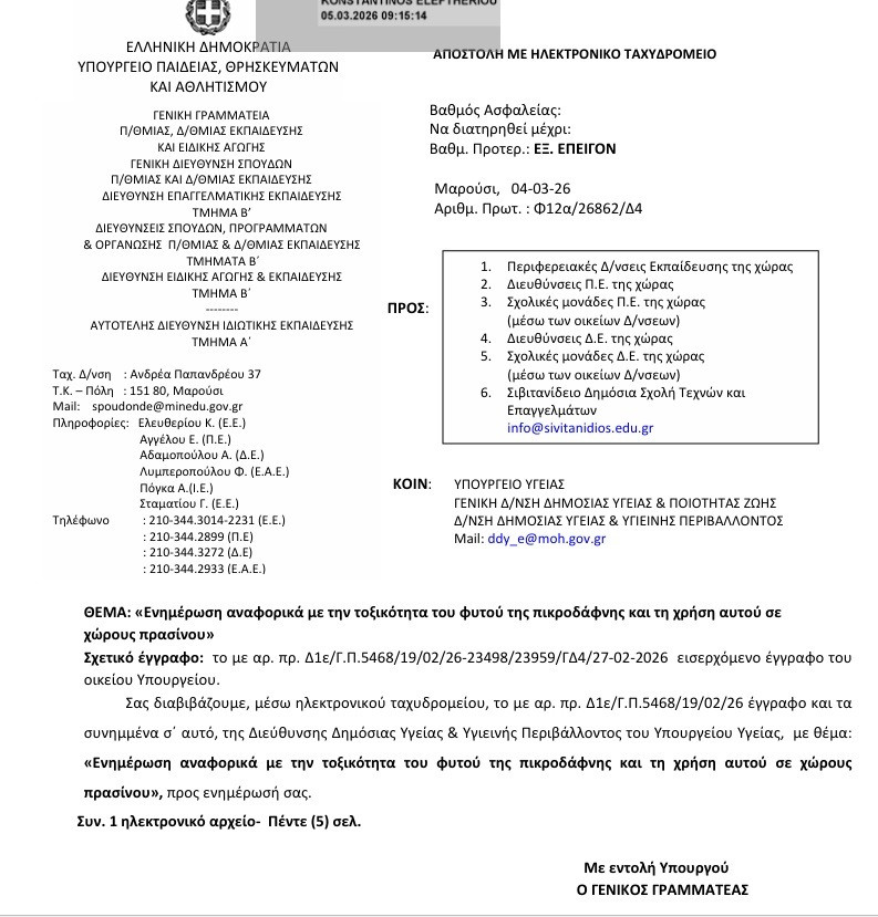 Ο ΕΟΔΥ και η Διεύθυνση Δημόσιας Υγείας & Υγιεινής Περιβάλλοντος του Υπουργείου Υγείας εξέδωσαν ενημέρωση αναφορικά με την τοξικότητα του φυτού πικροδάφνης (Nerium oleander) και τη χρήση του σε δημόσιους και σχολικούς χώρους πρασίνου. Η πικροδάφνη είναι γνωστό καλλωπιστικό φυτό, αλλά όλα τα μέρη του – φύλλα, άνθη, μίσχοι και ο χυμός – περιέχουν ισχυρές τοξίνες, κυρίως καρδιακές γλυκοσίδες, που μπορούν να προκαλέσουν ναυτία, έμετο, κοιλιακό άλγος, σοβαρές αρρυθμίες και ακόμη και αιφνίδιο θάνατο. Ιδιαίτερα ευάλωτα είναι τα παιδιά, καθώς η τυχαία κατάποση ή η επαφή με το φυτό μπορεί να οδηγήσει σε σοβαρές δηλητηριάσεις. Ο καπνός από την καύση του φυτού είναι επίσης πολύ τοξικός. Η οδηγία του ΕΟΔΥ στάλθηκε καθώς η πικροδάφνη είναι ένα από τα φυτά που φύονται κατά κόρον στα σχολικά προαύλια καθώς απαιτεί ελάχιστη συντήρηση.