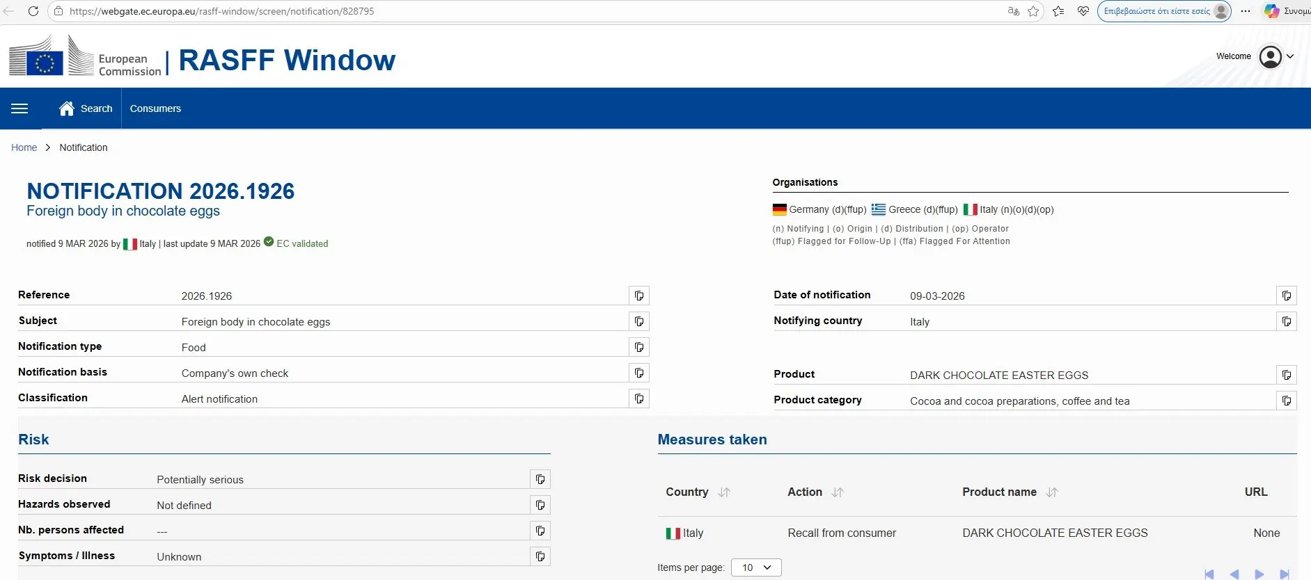 Η Ιταλία ενημέρωσε το Ευρωπαϊκό Σύστημα Έγκαιρης Προειδοποίησης για τα Τρόφιμα (RASFF) για πιθανή παρουσία ξένου μεταλλικού σώματος μέσα σε συγκεκριμένα προϊόντα.