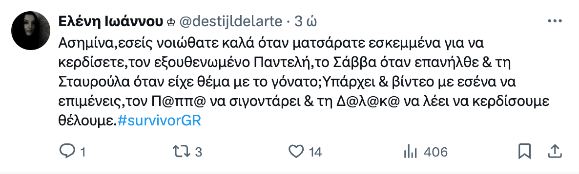 «Ασημίνα, εσείς νοιώθατε καλά όταν ματσάρατε εσκεμμένα για να κερδίσετε, τον εξουθενωμένο Παντελή, τον Σάββα όταν επανήλθε και τη Σταυρούλα όταν είχε θέμα με το γόνατο; Υπάρχει και βίντεο με εσένα να επιμένεις, τον Παππά να σιγοντάρει και τη Δαλάκα να λέει να κερδίσουμε θέλουμε. #survivorGR», σημειώνει κάποιος άλλος.