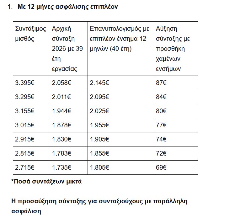 Συντάξιμος μισθός Αρχική σύνταξη 2026 με 39 έτη εργασίας Επανυπολογισμός με επιπλέον ένσημα 12 μηνών (40 έτη) Αύξηση σύνταξης με προσθήκη χαμένων ενσήμων
