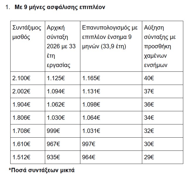 Συντάξιμος μισθός Αρχική σύνταξη 2026 με 33 έτη εργασίας Επανυπολογισμός με επιπλέον ένσημα 9 μηνών (33,9 έτη) Αύξηση σύνταξης με προσθήκη χαμένων ενσήμων