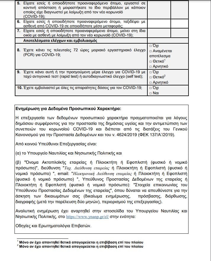 Στο έγγραφο εκτός από ορισμένα προσωπικά του στοιχεία, ο ταξιδιώτης συμπληρώνει στο έγγραφο – ερωτηματολόγιο, τυχόν επαφή με κρούσμα κορονοϊού και περιλαμβάνει εξειδικευμένες ερωτήσεις για τα τεστ, καθώς και τα εμβόλια. Δείτε αναλυτικά το έγγραφο: