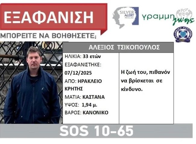 “Ο Αλέξιος Τσικόπουλος, 33 ετών, εξαφανίστηκε από το σπίτι του, στο Ηράκλειο Κρήτης, το πρωί της 07/12/25.